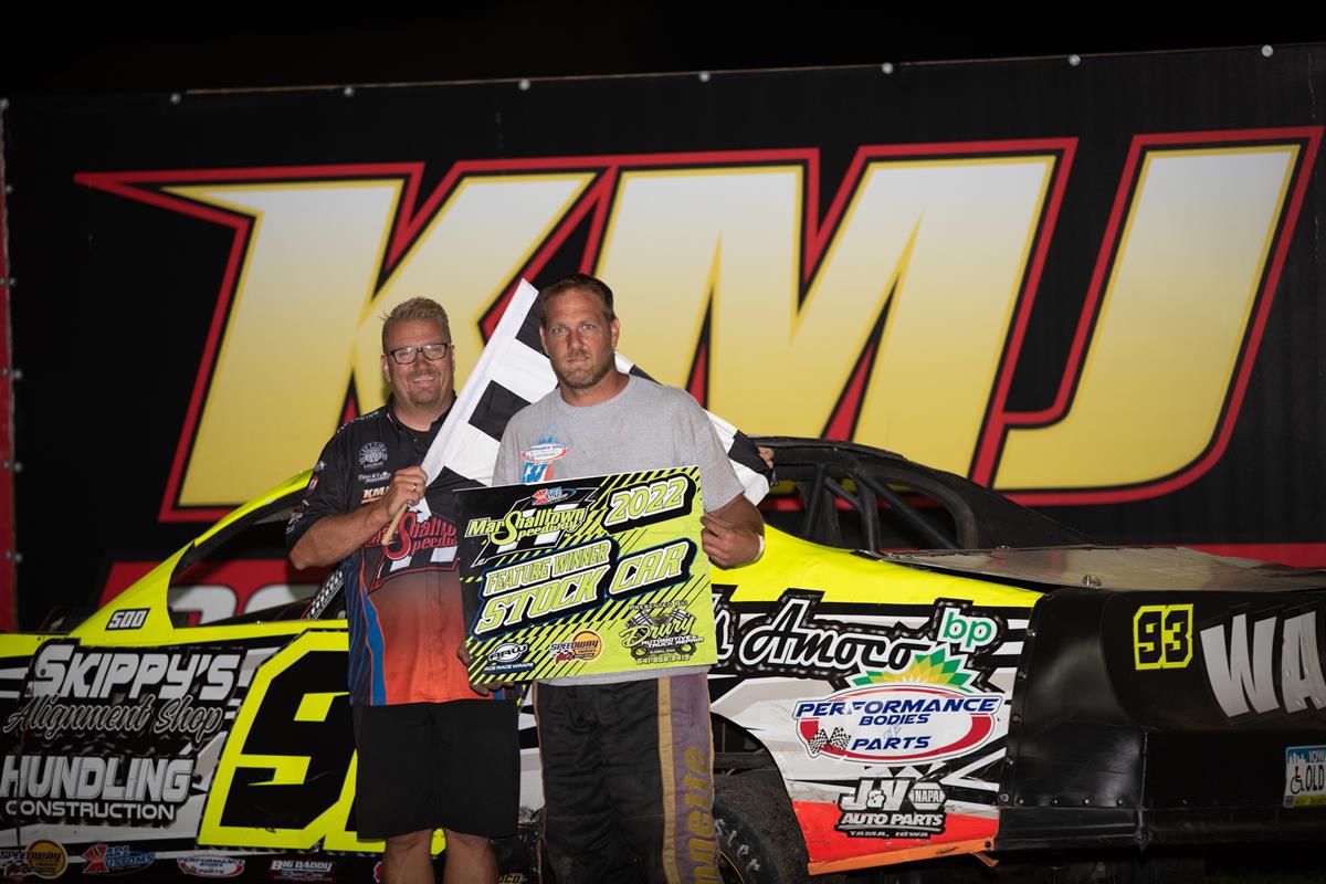 Eric Knutson went home with the win in the 20 lapper for the IMCA Hobby Stocks. He snatched the lead away from Rockwell, Iowa's Carter Koop with six laps remaining and held off a hard charging John Watson in second at the finish line. Carter Koop held on to finish third, and Sam West finished an impressive fourth after starting twenty-second. Cory VanderWilt, Sully, Iowa, was fifth. Knutson made this his third win of the year.