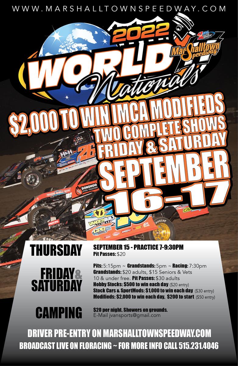 MARSHALLTOWN, Iowa – Two thousand dollars is the top prize for Friesen Performance IMCA Modifieds both nights of Marshalltown Speedway’s Friday and Saturday, Sept. 16 and 17 World Nationals.