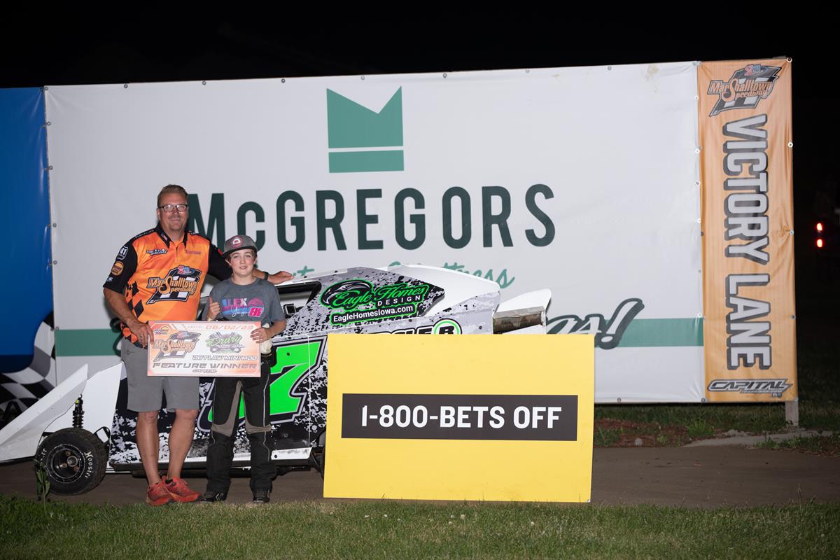 Olson started fifth and worked his way by early leader Cam Reimers to take the top spot. The two ran side by side down the frontstretch for several laps before Olson established the lead for good. Visiting driver from Colorado Springs, Colorado, Danny Concelman hard charged his way from starting tenth, to second place with a good late race run. Cam Reimers took third, fourth went to Sloan, Iowa's Willy Kirk, and rounding out the top five was eleventh place starter Jenae Gustin....in a borrowed car. This was Olson's second win of the regular season.