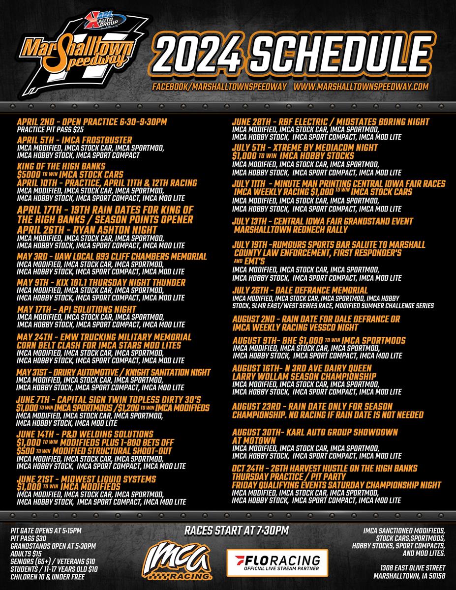 From start to finish the 2024 season has something for everyone and we hope this is the year fans and drivers check it off their bucket list. Full schedule with times, pricing, and classes can be found at marshalltownspeedway.com.
