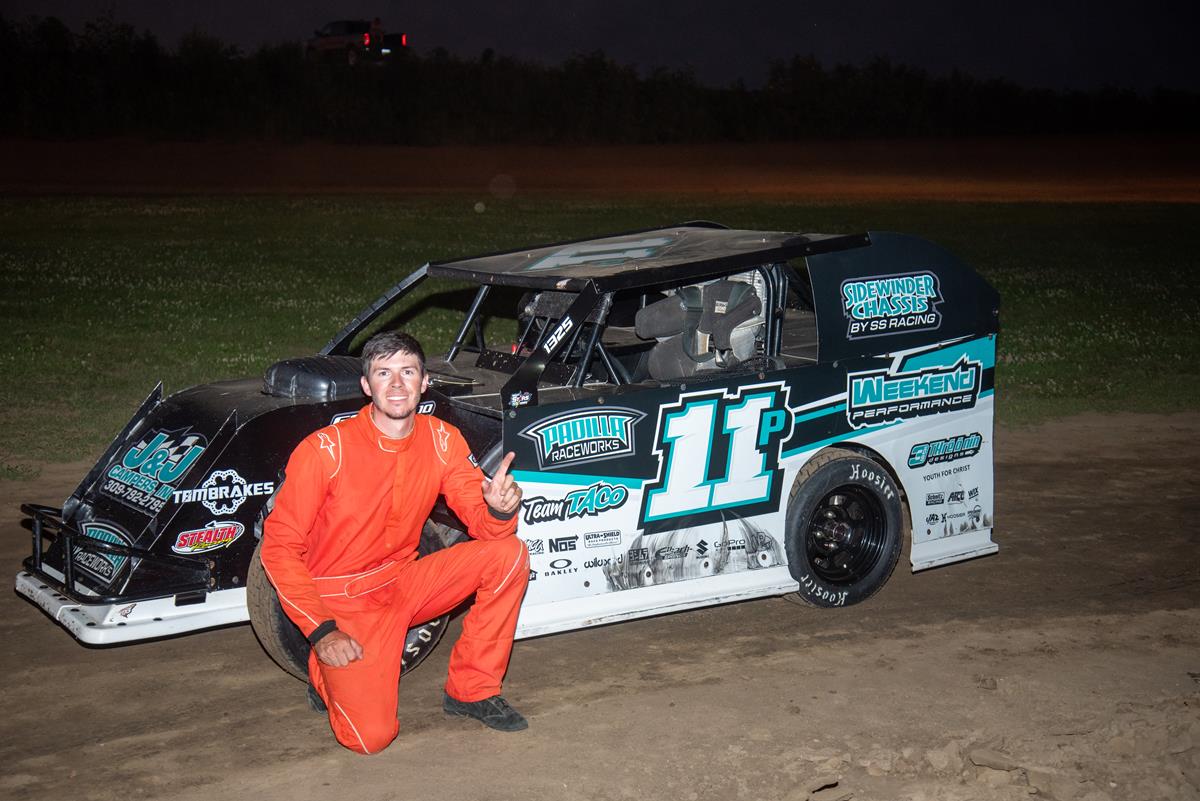 Cody Laney was the early leader of the pack but a slide by Tom Berry, Jr. made him the leader on lap 11. A yellow would fly at lap eleven when Rod Clement came to a standstill out of corner three, and then another yellow that went to red on lap fifteen when Trevor Fitz went off of the top of corner four and landed on his top. He was not hurt, and when racing returned to green, it was still Berry at the helm. Dylan Thornton had chased Berry in much of the race and a three car battle for third place between early leader Laney, Tripp Gaylord, and Joel Rust was brewing. Berry would hold on to his lead the final five laps to the finish and secure the win. Thornton finished as the runner up, Gaylord won the battle for third place, with Laney going fourth, and thirteenth place starter, and last week's winner, Tim Ward making a late race charge to finish in fifth place. Gaylord holds a ten point lead over Zack Rawlins as the season winds down.