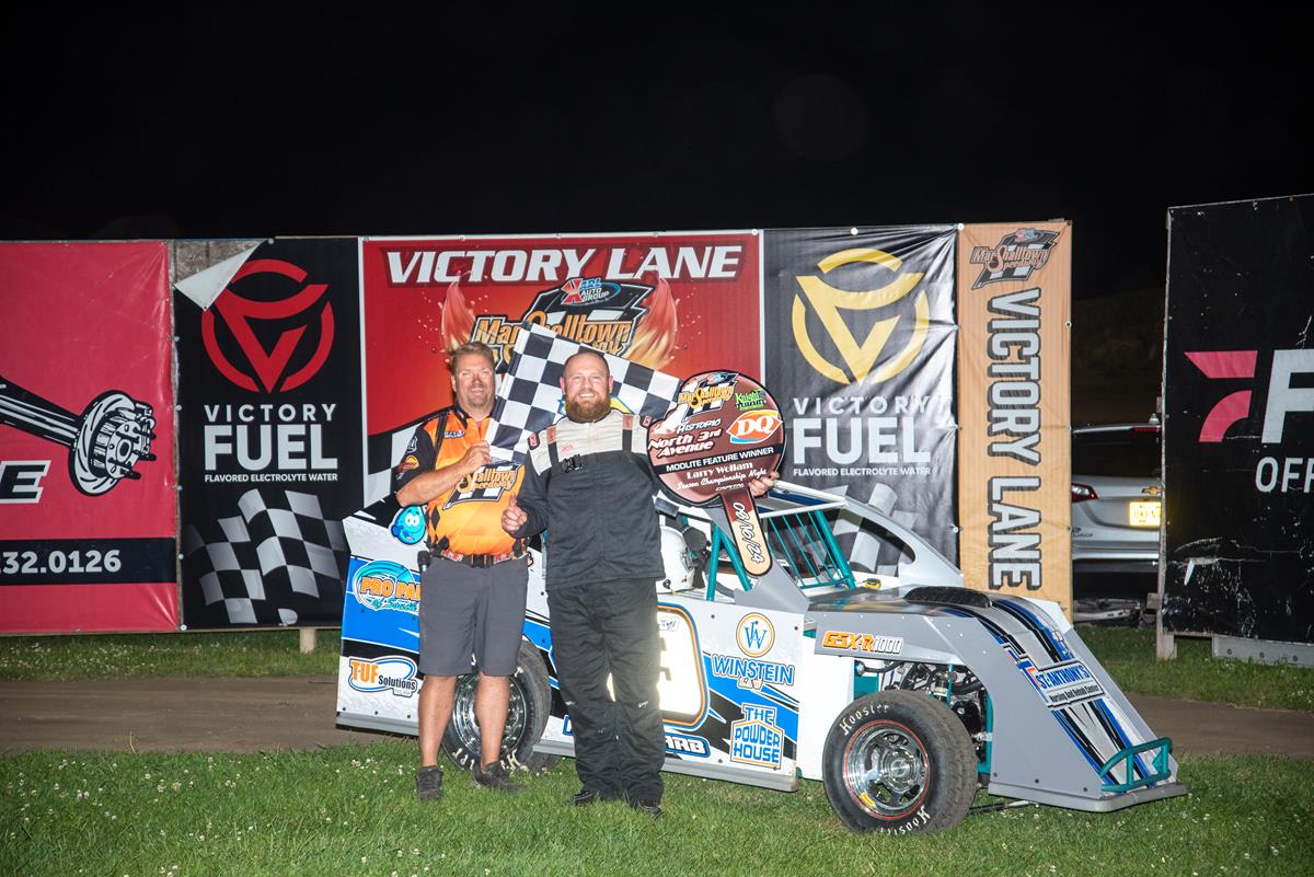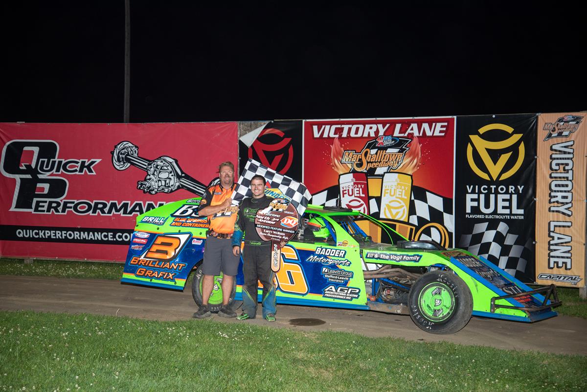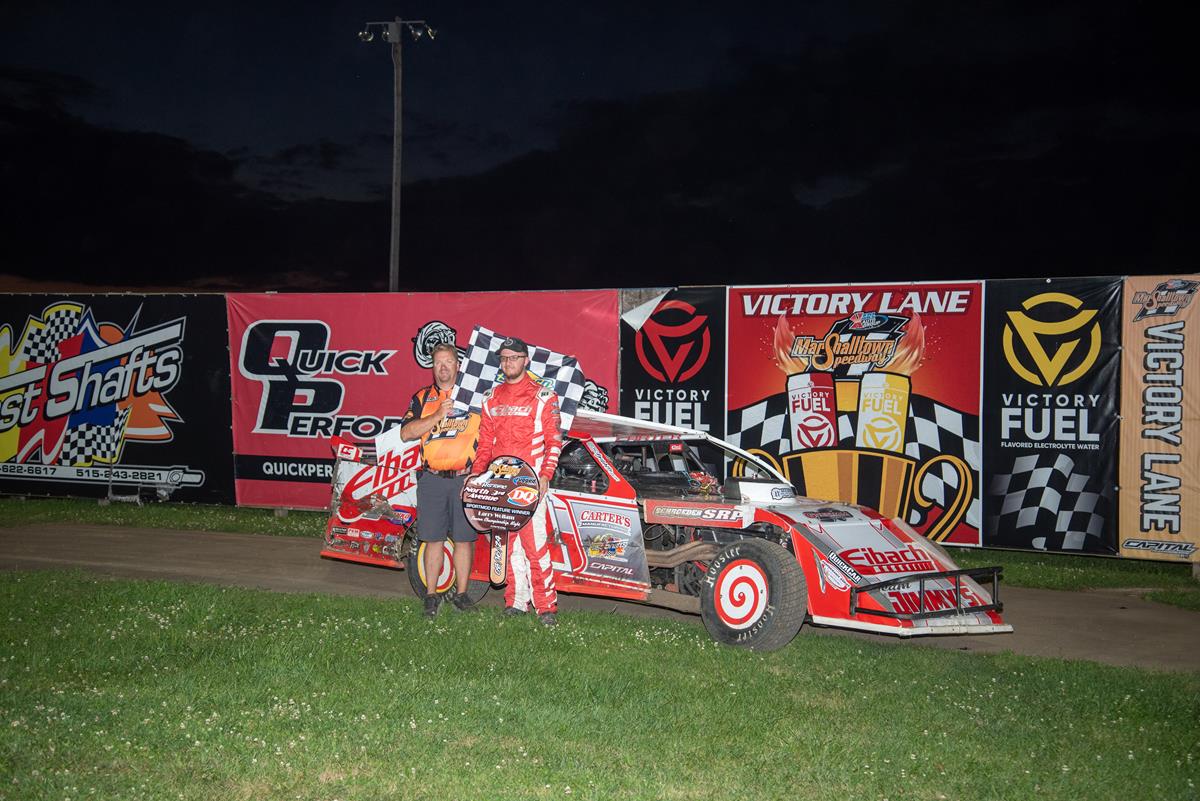 Brown grabbed the lead when the green flag flew with Brill giving chase. Brown continued his run at the front, but just before lap sixteen went into the books, he drove off of the track on the backstretch, and into the pits....his night ended. This put Brill to the point position and soon he had a pair #77s reeling him in. Austin Kuehl, Cave Creek, Arizona, and Tripp Gaylord, were duking it out for second place, and putting on a spirited battle. Brill never gave up his lead of the pack spot however, and went home to score the win...his first time at the Marshalltown Speedway. Gaylord finished second and sealed his track championship, third went to Austin Kuehl, fourth to Kaylin Lopez, and veteran racer David "Blue" Brown rounded out the top five.
